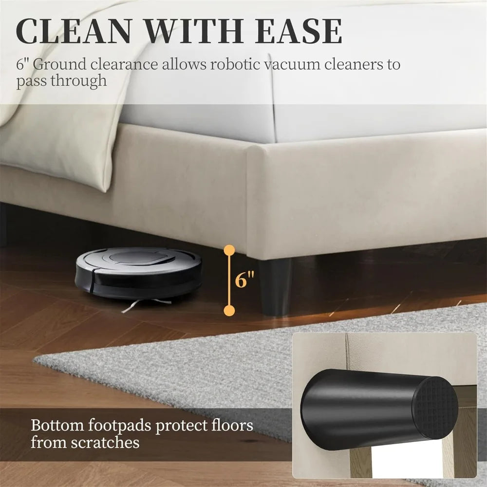 Transform your bedroom into a cozy retreat with this elegant upholstered queen bed frame. Designed for comfort and style, it features a plush tufted headboard with soft velvet fabric that feels smooth to the touch. The sturdy wooden slats provide excellent mattress support without the need for a box spring, ensuring long-lasting durability. With a robust construction that supports up to 800 lbs, this bed frame is built to last. The wing side design adds a touch of sophistication, while the 6-inch under-bed clearance makes cleaning effortless, allowing vacuum robots to glide underneath easily. Perfect for creating a serene sleeping environment, this bed frame combines functionality with aesthetic appeal. Key features include: 1. Comfortable Upholstery: The headboard is padded with dense foam and covered in skin-friendly velvet, offering a comfortable surface to lean against while reading or relaxing. 2. Sturdy Support: Interior solid wood framework and 12 durable wooden slats ensure even weight distribution and prevent sagging over time. 3. Easy Maintenance: Ample under-bed space simplifies cleaning routines, keeping your bedroom tidy without hassle. 4. Elegant Design: The symmetrical geometric shape and subtle beige tone enhance any decor style, from modern to rustic. 5. Space-Saving: No box spring required saves you money and reduces clutter in your room. Ideal for those seeking a reliable and stylish bed solution, this frame promises restful nights and effortless upkeep.