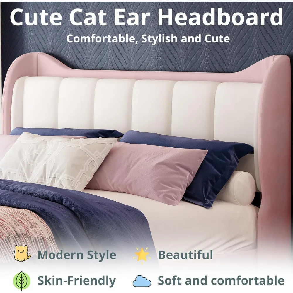 This king size bed frame, known as the LIKIMIO Floating Bed, boasts a contemporary floating design that not only prevents accidental collisions with bed legs but also facilitates easy cleaning under the bed. The bed features a charming cat ear-shaped headboard made from soft, skin-friendly materials, enhancing the aesthetic appeal and tactile comfort of your bedroom, while also adding a playful touch. It is equipped with an adjustable RGB LED light strip under the bed, which can be controlled via a mobile app or remote, offering a wide range of over 60,000 color options and various lighting modes to choose from. The bed is built for durability and quietness, with high-duty hidden support legs and wooden slats that can support up to 1000 pounds, along with silent strips designed to ensure a stable and peaceful sleep. Assembly is a breeze with numbered parts and clear instructions, making it easy to set up without the need for professional tools.