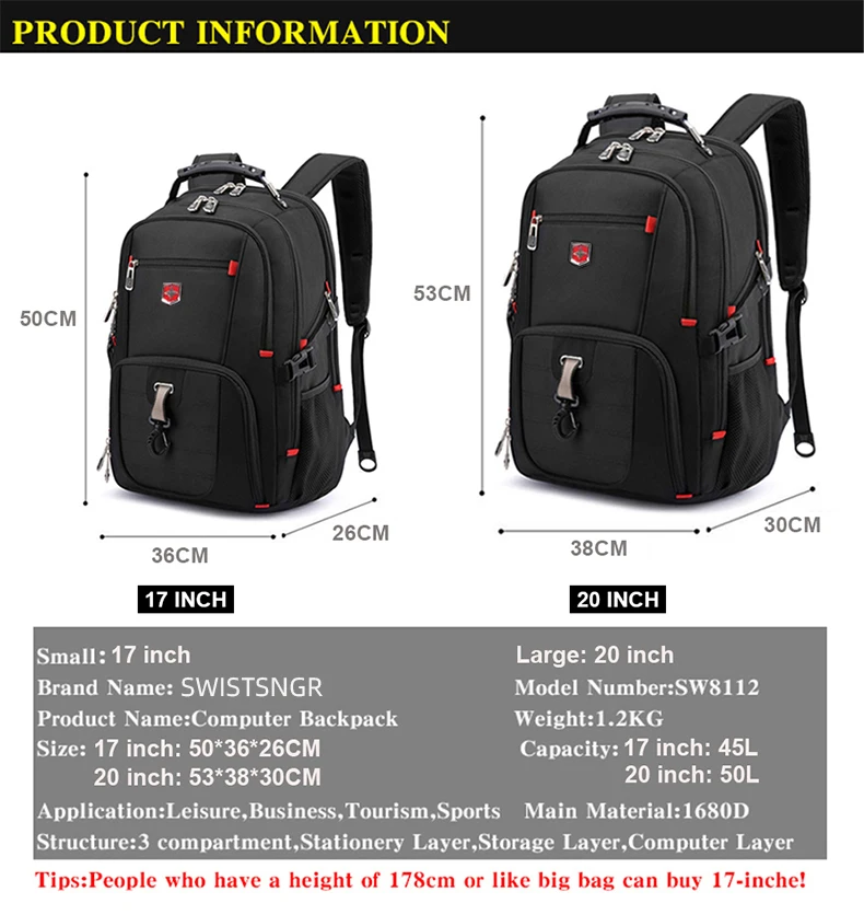 Waterproof Men's Backpack 17/20 Inch Laptop Backpacks School Travel Bag Swiss-style Large Capacity Business bagpack Male Mochila