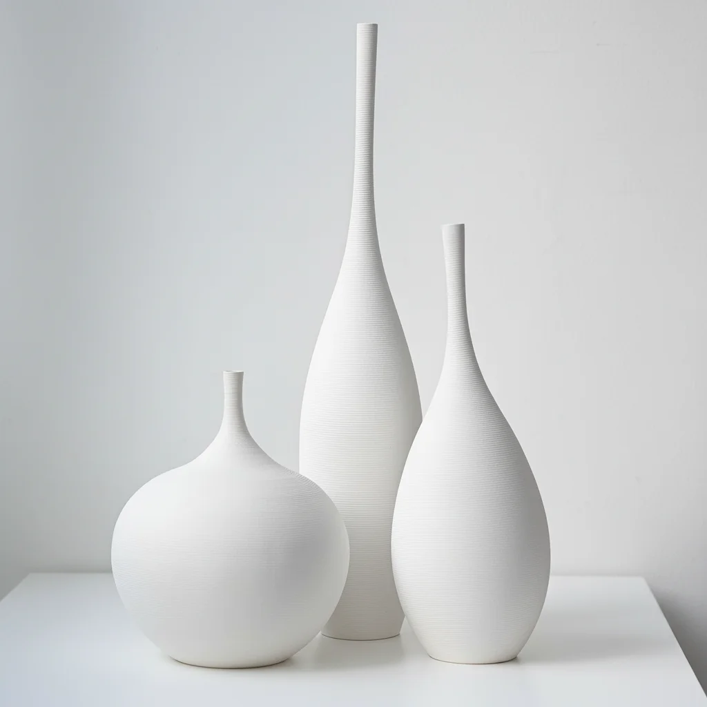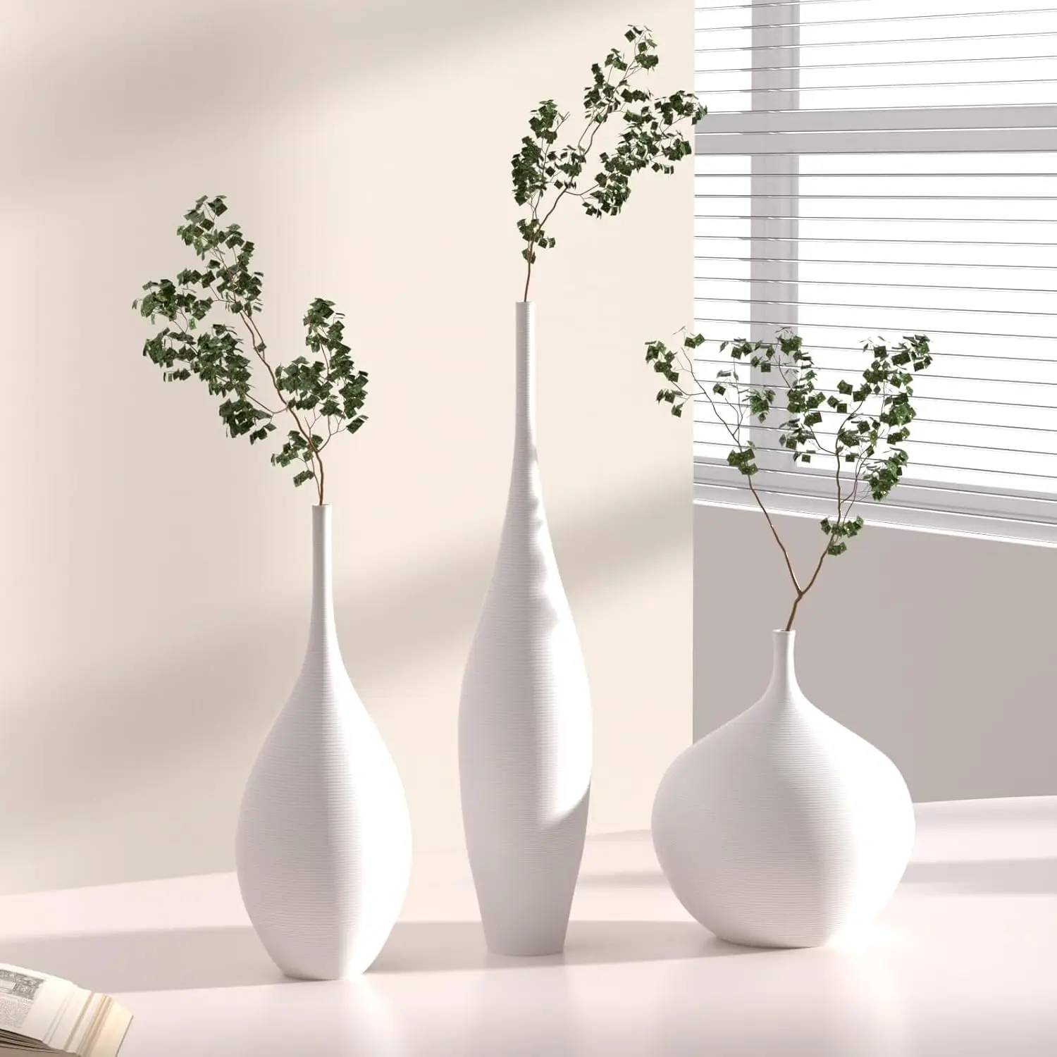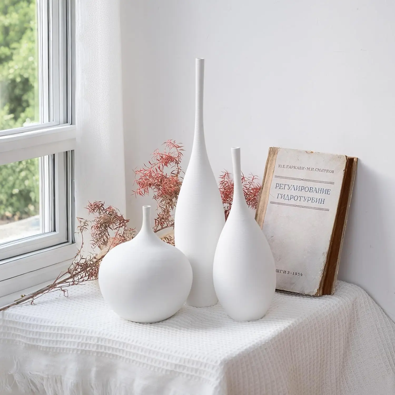 Transform your living space with this exquisite set of 3 white ceramic vases that blend modern elegance with boho charm. Crafted from premium hand-made porcelain, each vase features a beautiful matte finish with a special frosted texture that feels luxurious to the touch. These versatile vases are not just decorative pieces - they're designed to enhance any room in your home. **PERFECT SIZE FOR EVERY SPACE** Our vase set includes three thoughtfully sized pieces to create stunning arrangements: • Small Vase: 6.69''H x 5.11''W - Perfect for coffee tables and shelves • Medium Vase: 9.84''H x 3.14''W - Ideal for mantels and console tables • Tall Vase: 14.96''H x 3.14''W - Creates beautiful height variations **UNMATCHED QUALITY & CRAFTSMANSHIP** Each vase is meticulously hand-crafted using high-quality porcelain that ensures durability and longevity. The leak-proof design means you can confidently display fresh flowers or use them as elegant dry flower arrangements. The uniform texture and sturdy construction guarantee these vases will maintain their beauty for years to come. **VERSATILE HOME DECOR SOLUTION** Imagine these beautiful vases enhancing your: • Living room centerpieces that wow your guests • Bedroom nightstands with elegant floral arrangements • Office desk bringing natural beauty to your workspace • Bathroom counters adding spa-like tranquility • Dining table creating memorable dinner settings • Shelves displaying your favorite dried pampas grass The minimalist nordic design seamlessly blends with various interior styles including boho, modern farmhouse, rustic, cottage-core, and contemporary decor. Whether you're going for a full room makeover or just want to refresh your current setup, these vases provide the perfect accent piece. **MULTIPURPOSE ELEGANCE** Beyond their stunning appearance, these vases serve multiple functions: • Perfect for holding fresh flowers in water without leaks • Beautiful display for dried flowers and pampas grass • Elegant standalone decorative pieces when empty • Ideal for special occasions like weddings and showers • Makes a thoughtful housewarming or hostess gift The compact yet impactful design allows you to create beautiful arrangements without overwhelming your space. Mix and match the different sizes to create dynamic visual interest throughout your home. Ready to elevate your home decor? Click 'Add to Cart' now and discover how these beautiful ceramic vases can transform your living space into the stylish sanctuary you've been dreaming of. Your perfect home accent is just one click away!