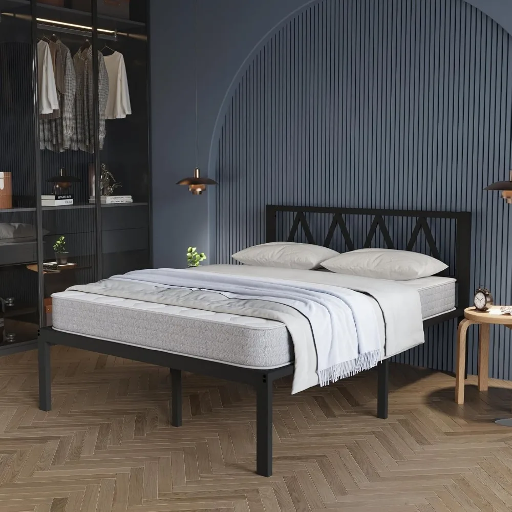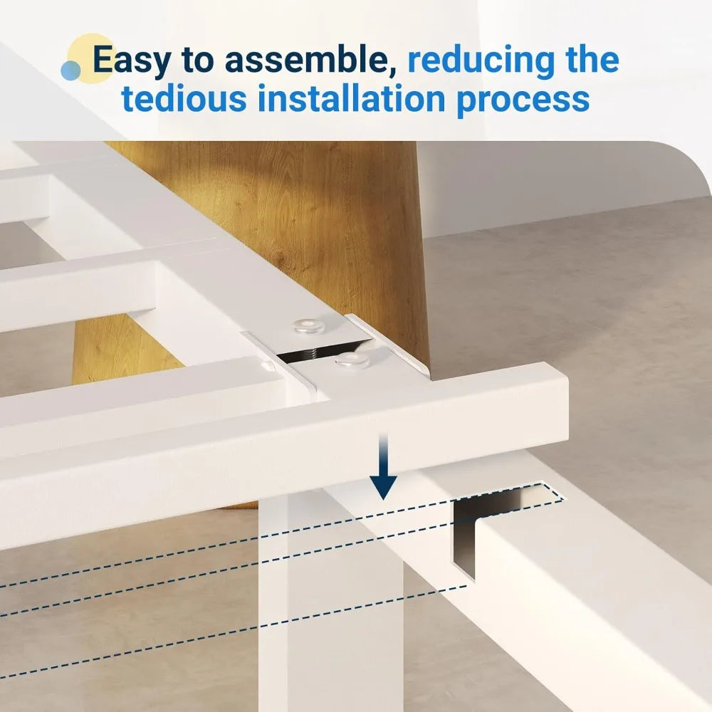 This bed frame is designed with a minimalist aesthetic, featuring clean lines that blend style with coziness. The elevated headboard offers extra support for your head, making it perfect for lounging with pillows while watching TV. It's a timeless choice that suits any decor. Constructed from premium metal materials, the bed frame boasts a reinforced design with thicker bed legs. We've enhanced its stability by adding more legs, allowing it to support up to 1000 pounds, ensuring a peaceful night's sleep. Our metal bed frame arrives with all the necessary components and a comprehensive guide for assembly. With clear instructions, you can put it together in just 20 minutes, making it suitable for various settings such as bedrooms, guest rooms, dormitories, and hotels. The elevated bed legs create a spacious area underneath for storage, helping to keep your room neat and facilitating easy cleaning. Customize the storage to fit your needs and maintain an organized space. To prevent any noise during sleep or movement, we've incorporated silent EVA foam strips on the middle beam to reduce friction between metal parts. This noiseless design ensures a quiet and undisturbed sleep without any squeaking sounds.