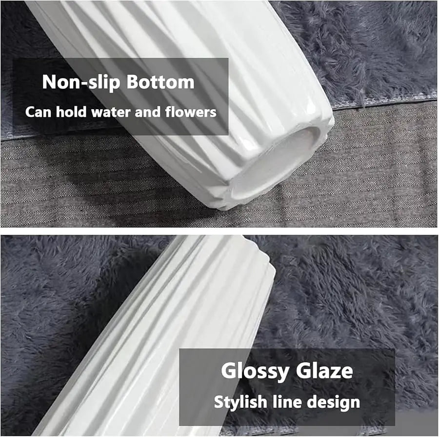 Material: This ceramic large vase is made of premium ceramic material, the bottom is designed with rough glaze, non-slip and good stability. The vase is finished with a smooth glossy white glaze and a unique origami line design. No holes in the bottom of the vase to hold water and flowers