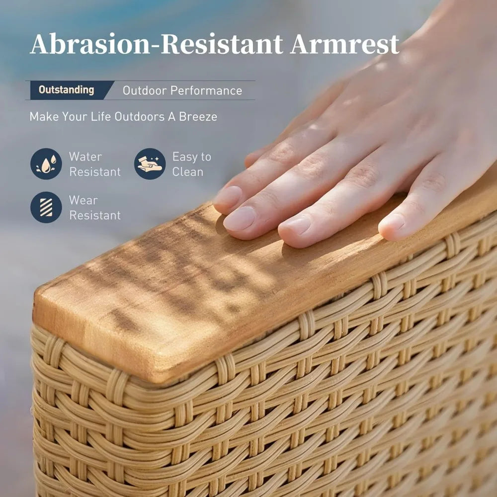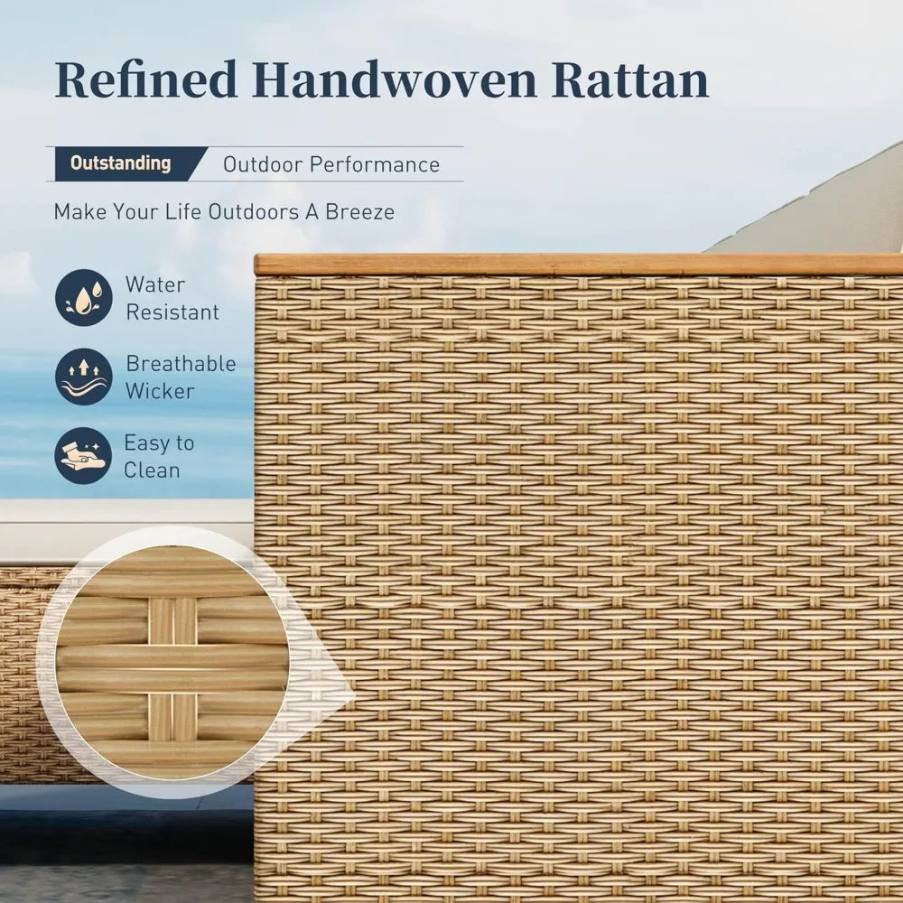 HAND-WOVEN, STYLISH RATTAN: Crafted by skilled artisans, this rattan of our patio furniture set showcases the rustic charm and modern sophistication. The intricate weaving not only adds a touch of elegance to your space but also ensures exceptional breathability and comfort, keeping you cool and relaxed NATURAL ACACIA WOOD FRAME: Experience the perfect blend of wood's natural elegance and contemporary craftsmanship with our outdoor conversation set. Framed by natural acacia wood, this sectional set is resistant to rust and cracking, and the PU paint on it protects the wood from rotting and fading WATERPROOF SEAT CUSHION: With our all-weather outdoor fabric, the seat cushion protects against rain, oil, and dirt, making it perfect for outdoor environments. The thickened high-resilience sponge provides durability and comfort, ensuring it retains its shape and support even after long use ELEGANT COFFEE TABLE: Upgrade your outdoor experience with our stylish and durable outdoor coffee Table. Made of high-quality acacia wood and woven wicker, this table is weather-resistant, fade-proof, and easy to clean—perfect for withstanding sun, rain, and everyday use FLEXIBLE SECTIONAL COUCH: Transform your patio, poolside, or garden into a cozy retreat with our premium outdoor sectional couch set! Designed for flexibility and comfort, this modular set allows you to rearrange the pieces effortlessly—create an L-shape for entertaining, or separate sections for versatile seating