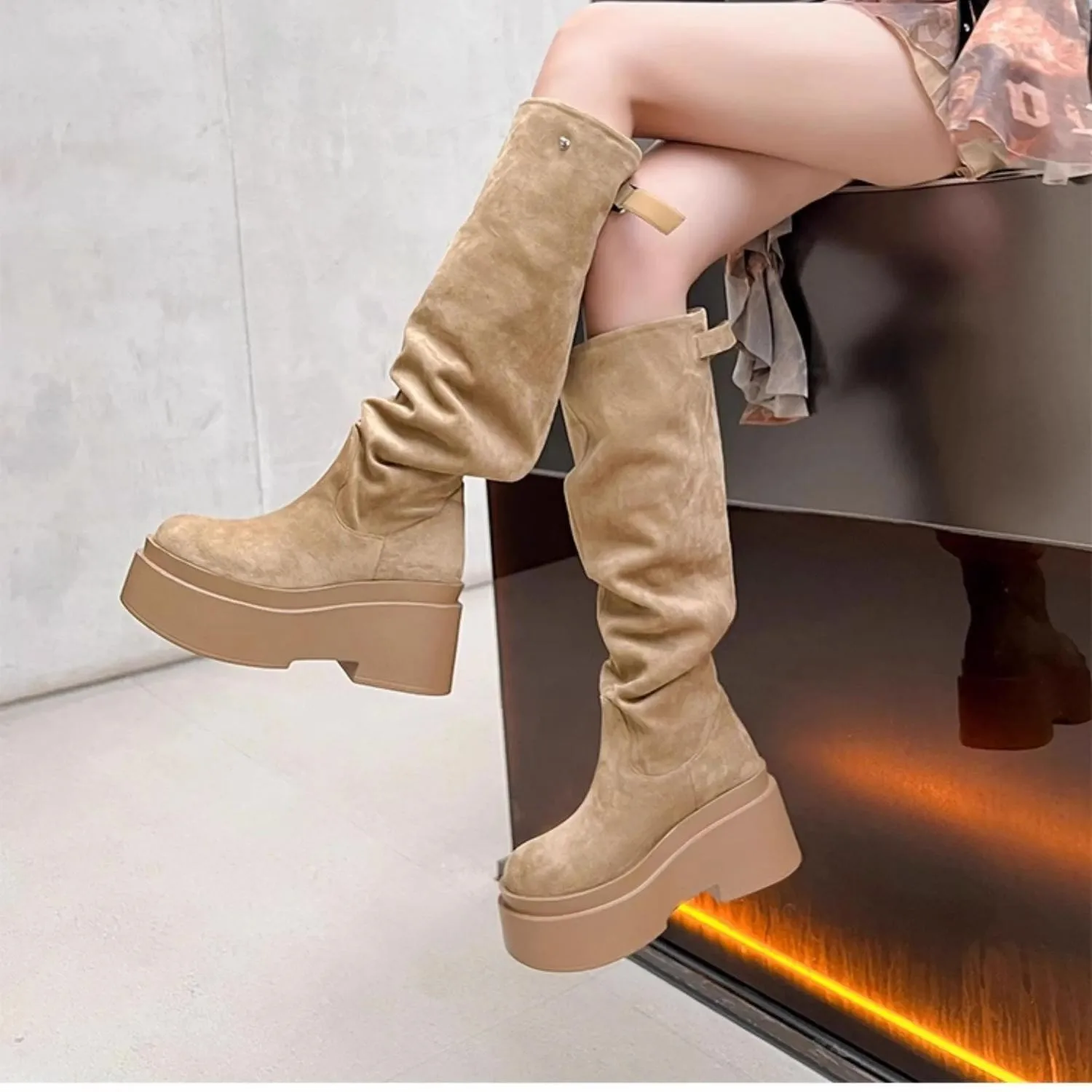 Women's Fashion Thick Heels Knee High Boots Khaki Flock Slip on Western Boots Woman Spring Autumn Soft Leather Short Botas Mujer