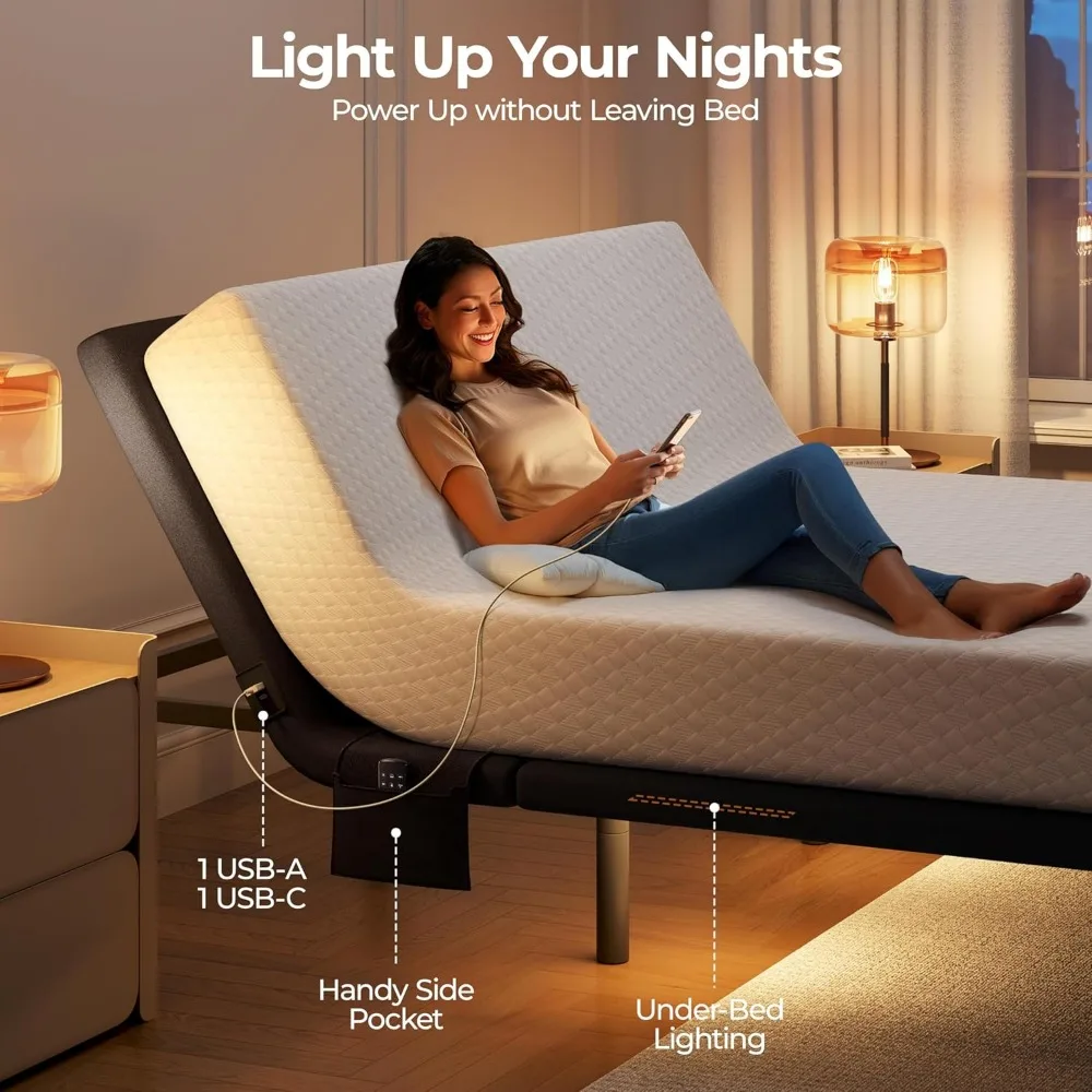 This adjustable bed offers a quiet massage function with independent control for head and foot massages. It features four frequency modes, four intensity levels, and three timing options, all powered by a noise-reducing motor for a peaceful experience. The bed allows for independent adjustability with the head section lifting up to 60 degrees and the foot section up to 40 degrees, providing personalized positions for relaxation, reading, or unwinding. An all-in-one remote control simplifies the adjustment of angles, activation of massage modes, and control of LED lighting. The bed base is designed with convenience in mind, including under-bed LEDs, USB-A and USB-C ports for charging, and a removable side pocket for essentials. Additionally, the adjustable bed frame offers four leg height options (8", 10", 11", 13") to accommodate various mattress and room setups, ensuring flexibility and easy accessibility.