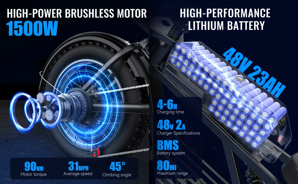 This electric bike is equipped with a powerful 1500W brushless motor with a torque of up to 85Nm. It can easily conquer steep slopes with a gradient of up to 35°. Equipped with 20-inch x 4.0 wide tires, this electric motorcycle is suitable for all terrains, including snow, beaches, mountains and city roads. The professional Shamano 7-speed system ensures precise and sensitive gear shifting.