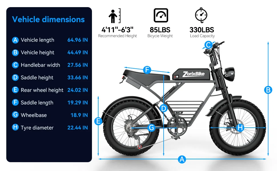 The adult electric dirt bike features an advanced LCD that provides real-time metrics, adjustable parameters, and various trip-tracking options. With bright LED headlights and IP5 waterproof protection, you can enjoy safe riding in diverse road conditions. The bike has a maximum load capacity of 330 lbs.